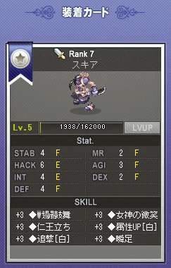 やっと・・・やっと・・・ できたー(´;ω;`)ブワッ 最初はボス用と狩り用で分けようかと思ってたけど めんどくさくなって結局1枚にしました まあこの組み合わせが良かったのかっていうと どーなんでしょうね ぶっちゃけ仁王立ちより鋼の肌の方がいいし 夜行性入れたかった気もするし でも真アジ登録できてない となんか色々あるけど カードスキル下方修正の可能性があるらしいから とりあえずしばらくこれで様子見 今回よく分かったのは 自分の理解力なさ でした(´・ω・`) とにかく作ってる途中で何回もミスしました・・・ 最初からやり直しはせず ミスした所から修正する感じでやったので もう何枚合成したのか分かりません/(^o^)\ SEEDもかなり無駄に消費した・・・と思う でもおかげさま(?)で どうやって作っていけばいいのかわかったよ!さすがに! てか、やっぱ理解するためには自分で作った方がいいね 理解力がないせいでwikiとかしたらば読んでても どーしても分からない所があったけど 実際自分で作ってみたらよく分かったよ 次はサブ用の汎用性があるカードでもつくろっかな @アナイス用も作りたいけど、別IDなんだよなぁ・・・ |