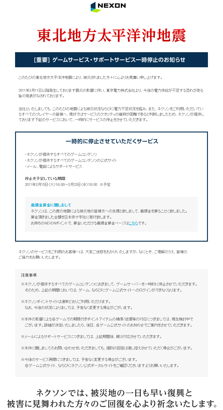 22日は休みを取って21日から一泊で温泉の予定だったのですが 地震発生後に相談した結果、予約をキャンセル 落ち着くまで延期することにしました まだ休みの許可を貰う前だったのですが 計画停電の影響で結局22日は休みになっちゃいました 4連休あっても、ガソリンがね・・・ 会社の通勤も危うくなるのでどこにも行けませぬ 土日は基本的に休みなんですけど これから先は計画停電が終わるまで休みは不定休になりそうです 今回の1000年に一度と言われてる巨大地震について 自然災害がここまで恐ろしい物だとは思っていませんでした 被災地の過酷な状況 周りの反応や対応、行動について 色々思う事があり、自分自身も色々考えさせられました その事についてブログで書こうと思ってたんですけど あまりにも纏まらないので辞めておきます 私が住んでる所は最初大きく揺れただけで被害はほぼないものの 震災前のいつもの生活が戻ってきたわけではありません まだ大きな余震がおこる可能性もあるし・・・ 物資が一時的に不足したり(もう戻ってきてはいますけど) ガソリンの供給もまだ安定はしていないし 計画停電はまだまだ続きます 地震の影響で大切な人に会う事もできません でも命があって家で普通の生活ができてるんです すごく幸せな事ですよね 今の気持ちを忘れないように生きていきたいです 次回からはいつもの呑気なゲーム記事に戻します! |